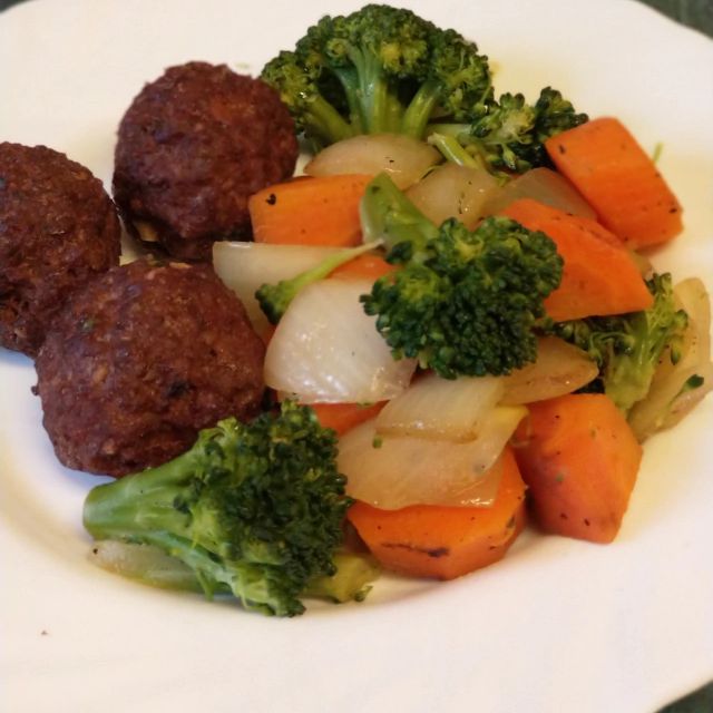 Medallón veggie a la napolitana c/bastones de papa y zanahoria asada.