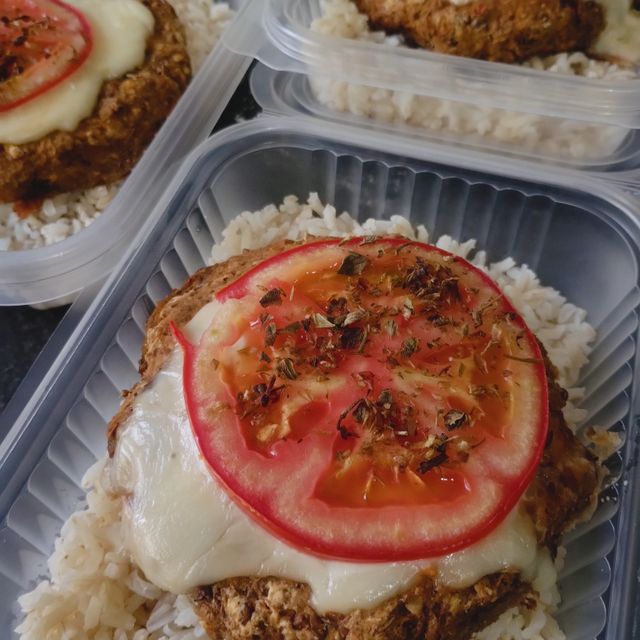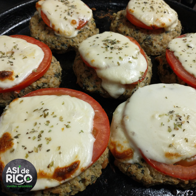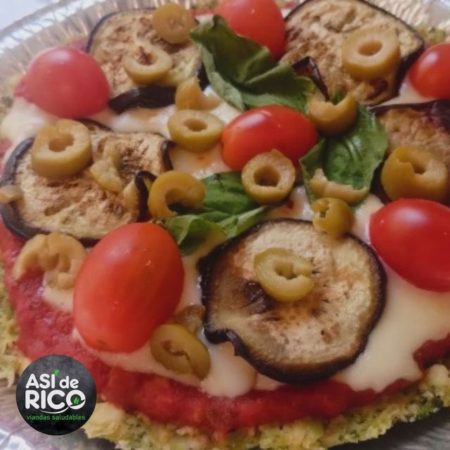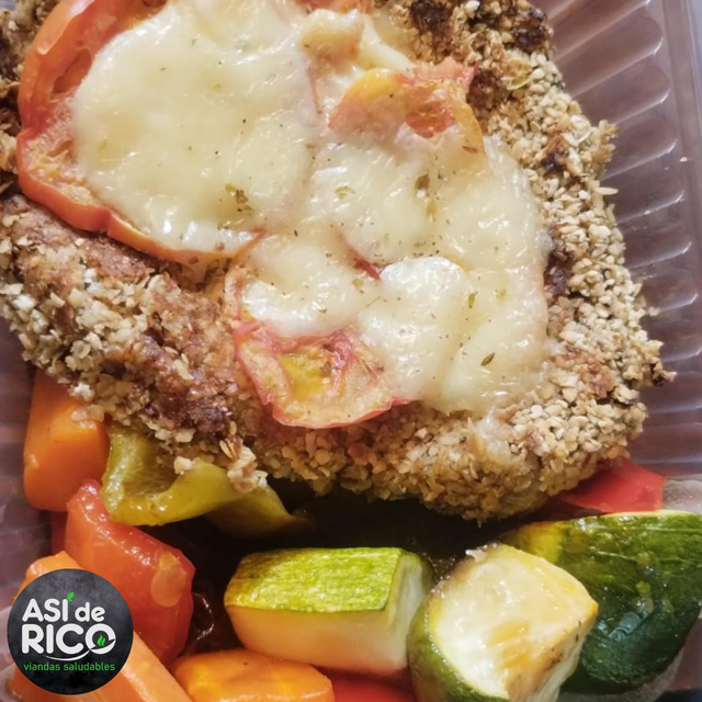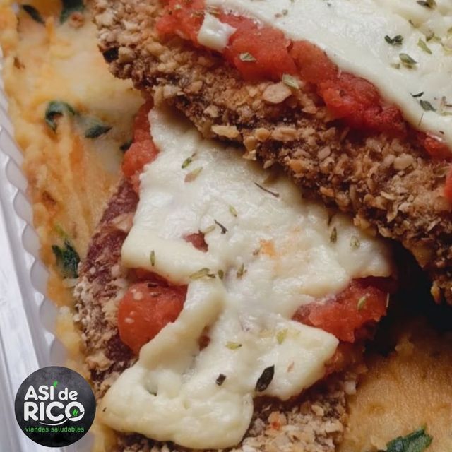Milanesa de berenjena a la napolitana con arroz integral primavera