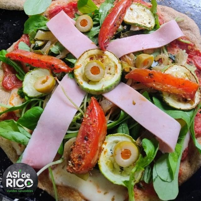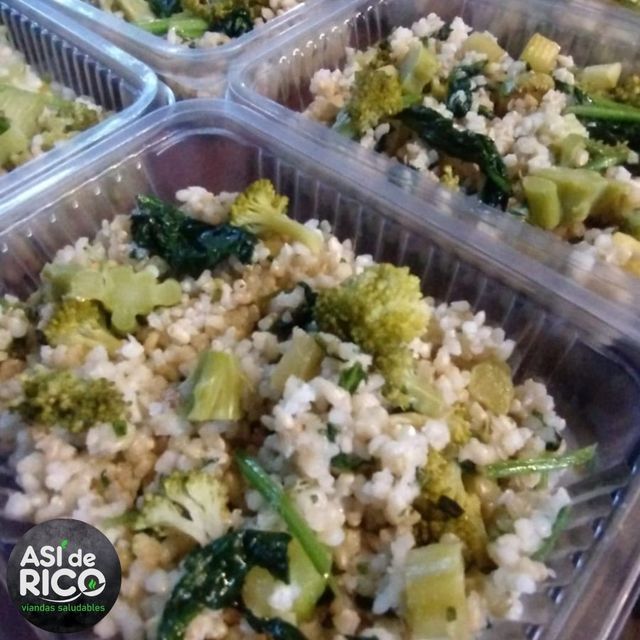 Pasta integral, brócoli, jamón, cebolla morada caramelizada, nueces, aceitunas, calabaza asada, Cherry.