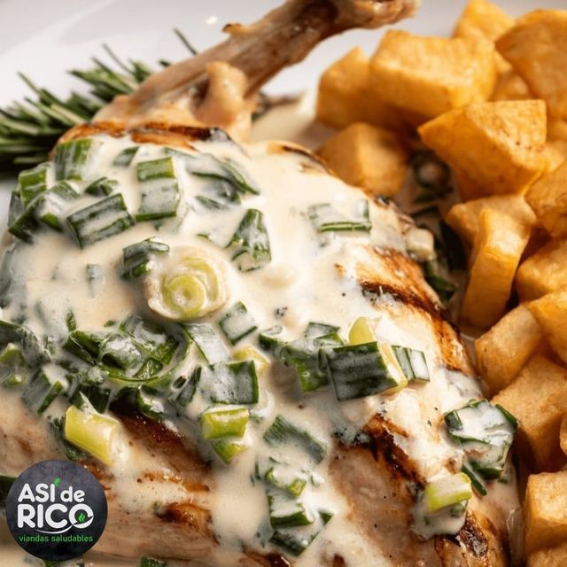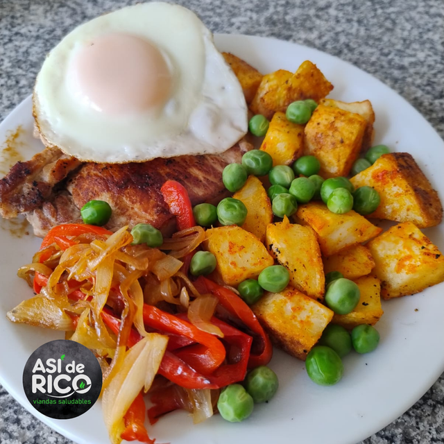 Carre de cerdo a la riojana c/ papas al horno + huevo a la plancha