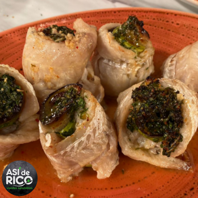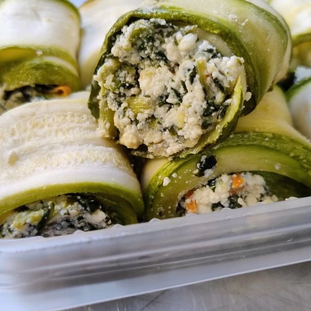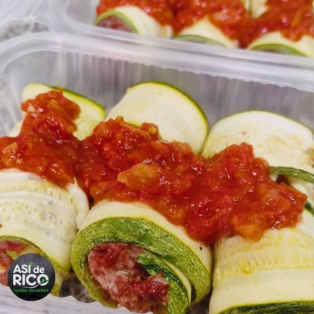Rollitos de zucchini rellenos de ricota, jamón c/salsa de tomate.