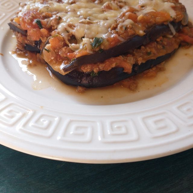 Lasagna de berenjena con capas de bolognesa y bechamel.