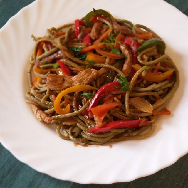 Suprema a la plancha con pasta integral y verduras salteadas.