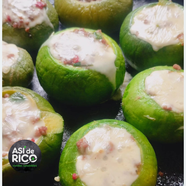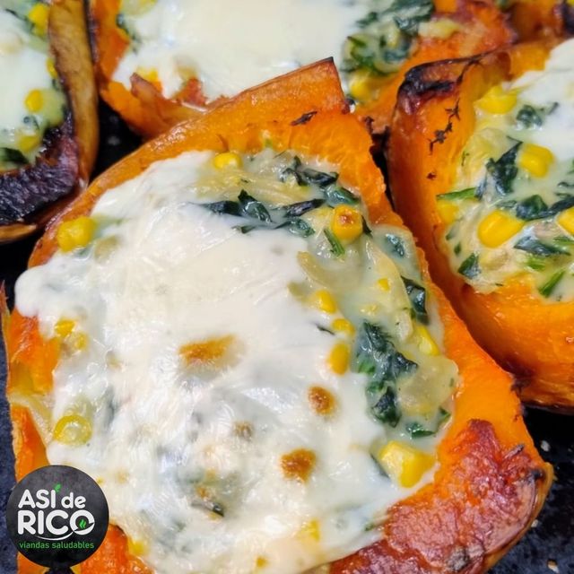 Calabaza rellena de carne c/crema de espinaca, choclo y queso gratinado.