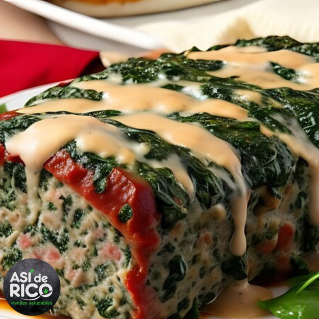 Pan de carne c/crema de espinaca + tomate y zanahoria gratinados al horno.
