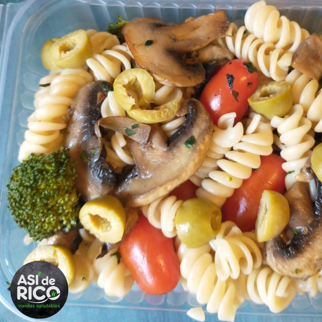 Ensalada de pasta integral con brócoli, Cherry ,champiñones y aceitunas