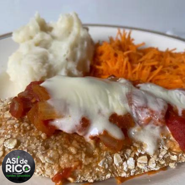 Milanesa carne rebozada en avena y semillas a la fugazzetta con pure tricolor (papa, calabaza y espinaca)